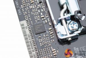 The CPU PWM controller is an Intersil ISL95866c which is a 4+3 channel controller. In this instance it appears to be operating as a 4+2 phases solution with four phases for the vCore and 2 phases for the iGPU. It includes two integrated drivers for the vCore and one for the iGPU.