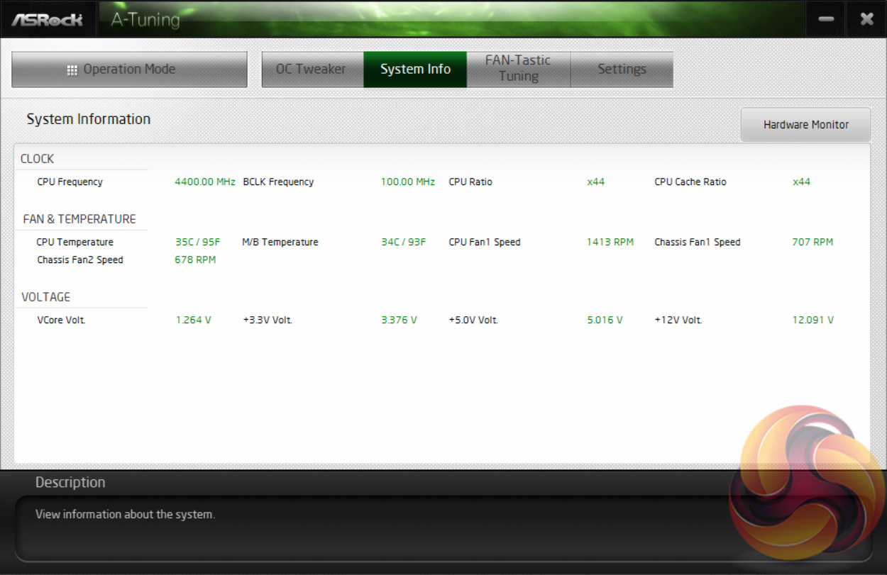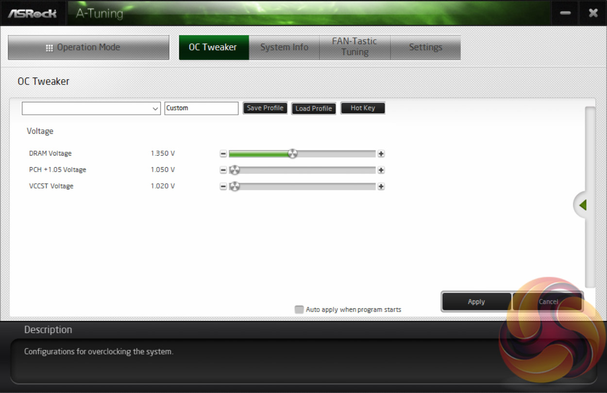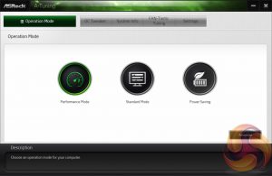 A-Tuning, ASRock’s equivalent to ASUS AI Suite, Gigabyte EasyTune and MSI Command Centre, allows you to tune the fan speeds with the ASRock FAN-Tastic tuning, set power/performance profiles and change some relatively insignificant system voltages. It’s a reasonably well polished piece of software, is light on system resources and is not very intrusive.