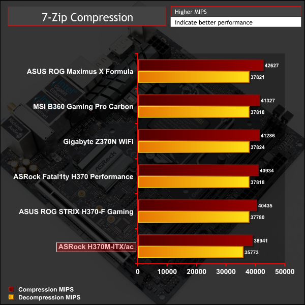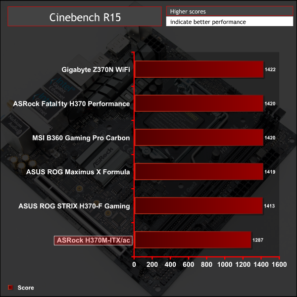 The CPU tops out at 3.9GHz on an all-core load whereas, with all other motherboards tested, this happened at 4.3GHz. The reduced frequency shows later on in the power consumption results. ASRock explained to us that this is a deliberate decision as the H370M-ITX/ac is an “entry level” motherboard which is not designed to run a Core i7-8700K at a 4.3GHz turbo frequency for an extended period of time.