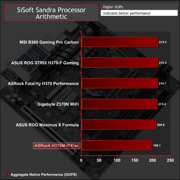 SiSoft Sandra 2017 is a multi-function utility program that supports remote analysis, benchmarking and diagnostic features for PCs, servers, mobile devices and networks. We run the application’s processor arithmetic test to gauge the CPU performance on each tested motherboard.