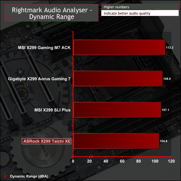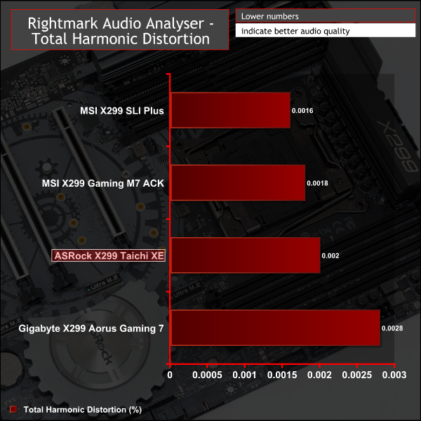 Rightmark Audio Analyser is a freeware benchmarking utility designed to objectively test the performance characteristics of audio solutions. We setup a line-in line-out loop and execute the record/playback test before generating the results report you see below. A sampling mode of 24-bit, 192 kHz is tested where available. If unavailable the closest alternative operating mode available is used and clearly marked.