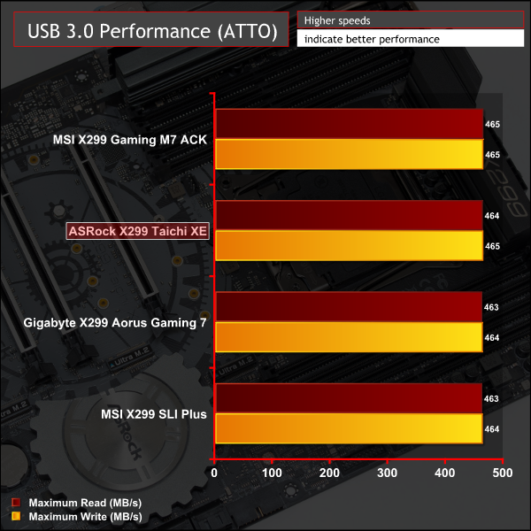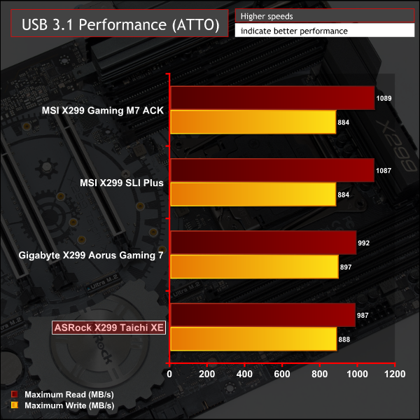USB 3.0 performance met expectations but USB 3.1 was about 100 MB/s down where we’d expect it to be. There was no obvious explanation for this performance since the rear USB 3.1 ports use the same ASM3142 controller as the MSI X299 motherboards on test and aren't routed through any additional hubs or controllers.