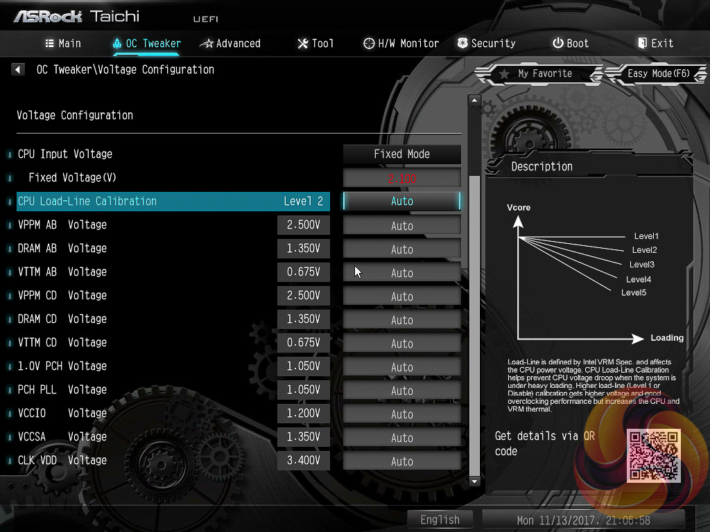 Voltage configuration is specifically for the various programmable voltages on the motherboard including CPU Input Voltage (VCCIN), VCCIO, VCCSA and PCH voltages. The CPU load line calibration controls are also held within this section and span five different levels with the Level 1 profile having no reduction under load and Level 5 the most reduction.