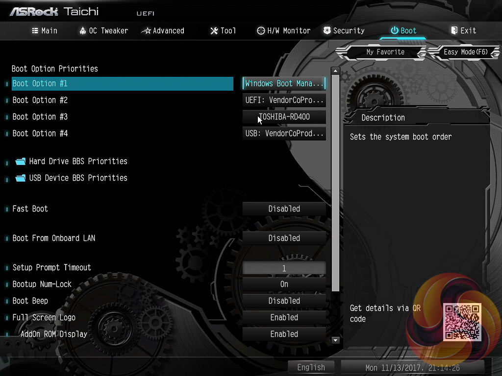 Like all motherboard vendors the ASRock UEFI offers an “EZ MODE” option (read: easy mode) intended to provide a quick summary of commonly accessed UEFI options like boot order, XMP memory profiles and fan speeds.