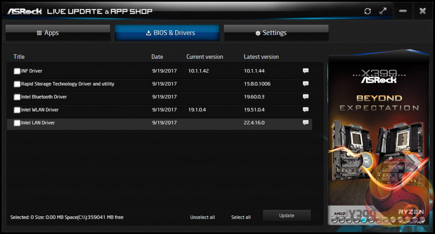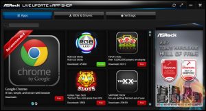 ASRock’s App Shop provides the dual role of serving out ASRock’s own software and approved third party software, but also includes a MSI Live Update-style function which scans for certain BIOS and driver versions and informs the user when a newer version is available. It’s reasonably useful for both of its provided functions and isn’t too intrusive, but does pop up the occasional notification in Windows 10.