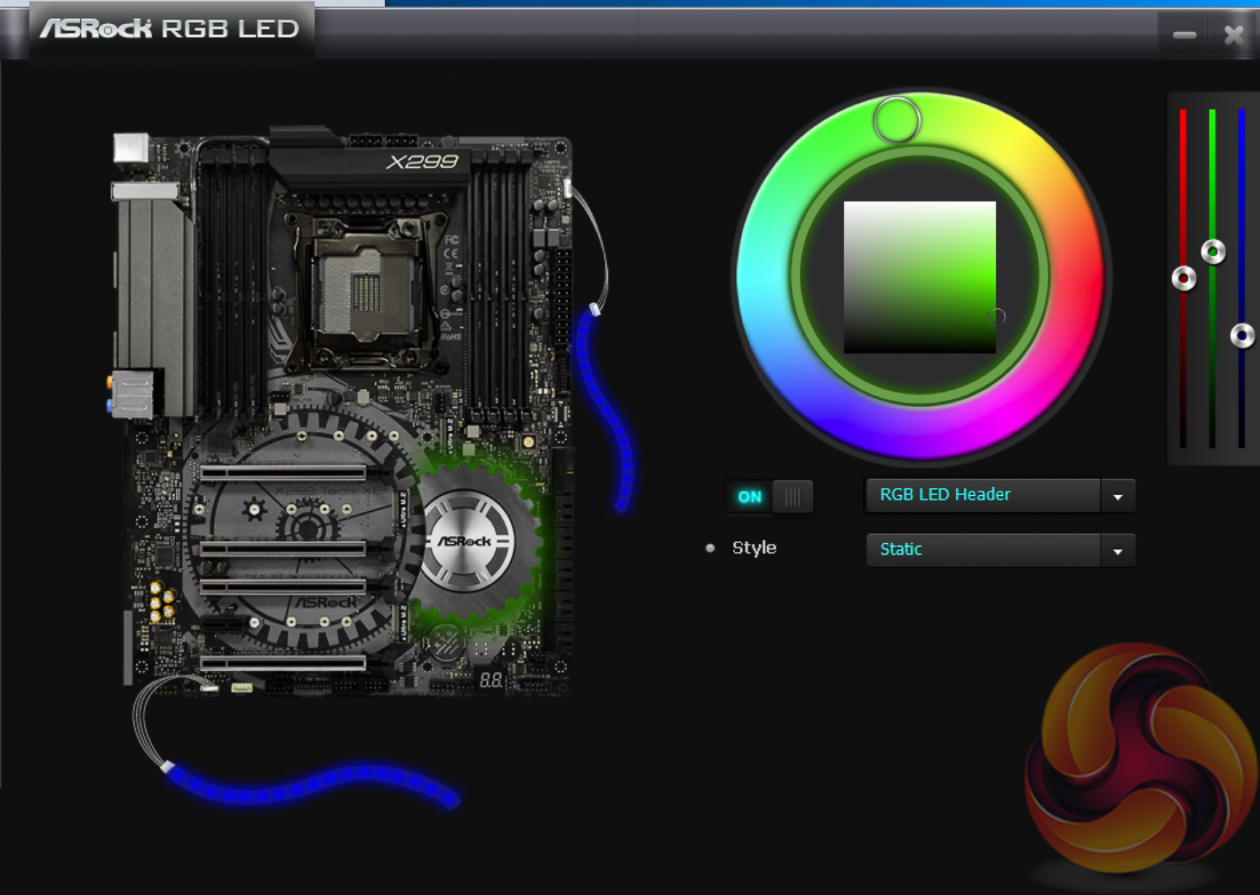 The ASRock AURA RGB LED software allows you to individually tune the main LED regions of the motherboard which are the Chipset heatsink (onboard LEDs) and two RGB LED headers (both optional and not included). It works by selecting the colour on the outer ring first, then the inner ring after and then you can pick the style from the drop down menu, there are currently 7 modes as shown above.