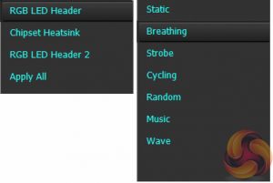 The ASRock AURA RGB LED software allows you to individually tune the LED regions of the motherboard which is only a single RGB header for this motherboard. It works by selecting the colour on the outer ring first, then the inner ring after and then you can pick the style from the drop down menu, there are currently 7 modes as shown above.