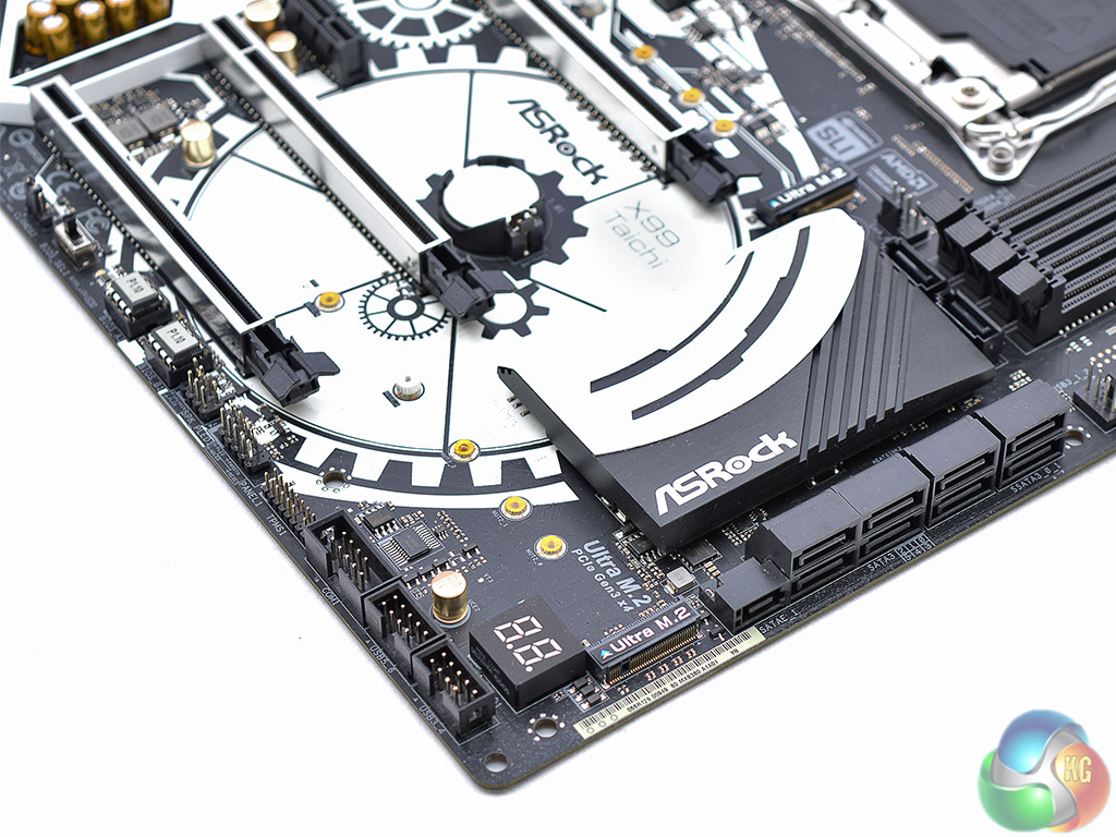 Towards the lower corner of the motherboard a debug LED is found next to one of the two M.2 ports. There are no onboard power or reset buttons which seems to be one of the limitations of the X99 Taichi.