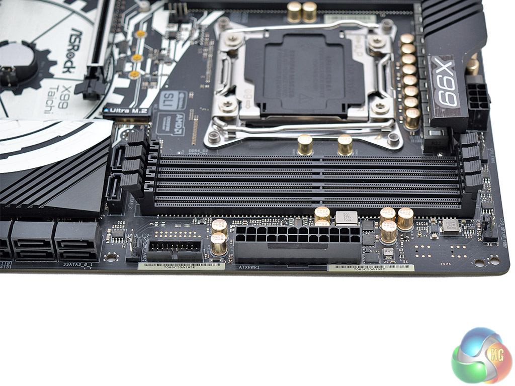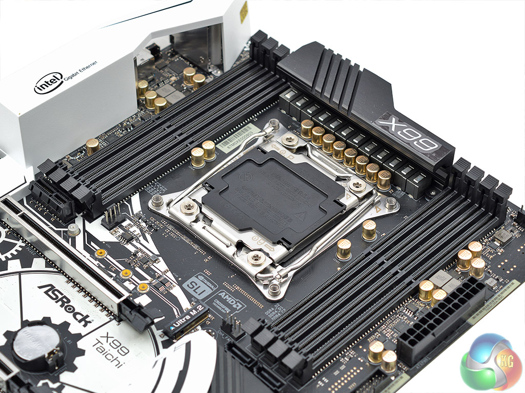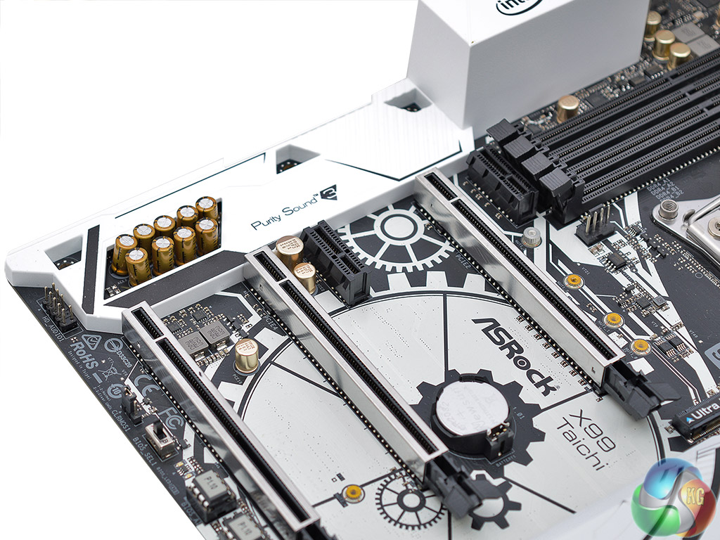 Styling with the X99 Taichi is bold and certainly unique in comparison to a market saturated by gaming X99 motherboards. The theme of machinery and cogs we observed on the packaging translates directly onto the motherboard which has a white printed overlay in the lower section of the motherboard. Cleverly, ASRock integrates the CMOS battery into this design to make it appear as part of the style.