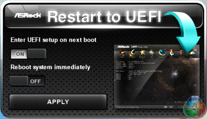 A lightweight and completely independent utility ASRock provides that does come in handy is the Restart to UEFI software. Think of it as a software equivalent of the boot-to-BIOS buttons that went out of fashion a while ago. This will probably be useful for anyone who frequently tweaks UEFI settings, or has multiple UEFI profiles that they switch between depending on circumstances.