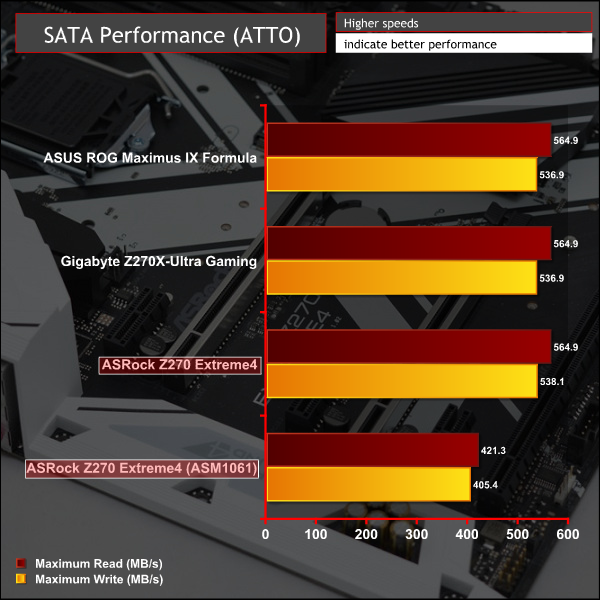 Chipset SATA performance is right where it should be while the third party chip ASRock includes is about 25% slower for SATA throughput.