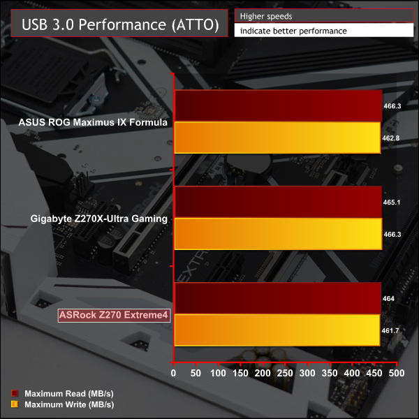 USB performance across both 3.0 and 3.1 interfaces falls in-line with expectations for the respective controllers, Z270 and ASM2142.