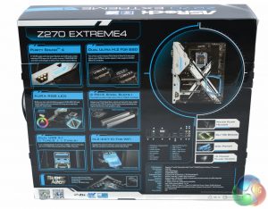 ASRock's Z270 Extreme4 is presented in a large retail package complete with convenient carry handle. The company's marketing is well-executed as the box gives a clear and concise summary of the main selling points for this motherboard.