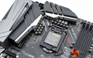 An initial glimpse at the CPU socket gives the impression that a 14-phase CPU is in operation. However, as we'll detail later it's actually a 10+2+1+1 solution for VCore, iGPU, VCCSA and VCCIO, respectively. It does, impressively, have a heat pipe cooling solution which should keep temperatures down when overclocking, though airflow to the rear-most CPU heatsink will be somewhat restricted because of the I/O cover.