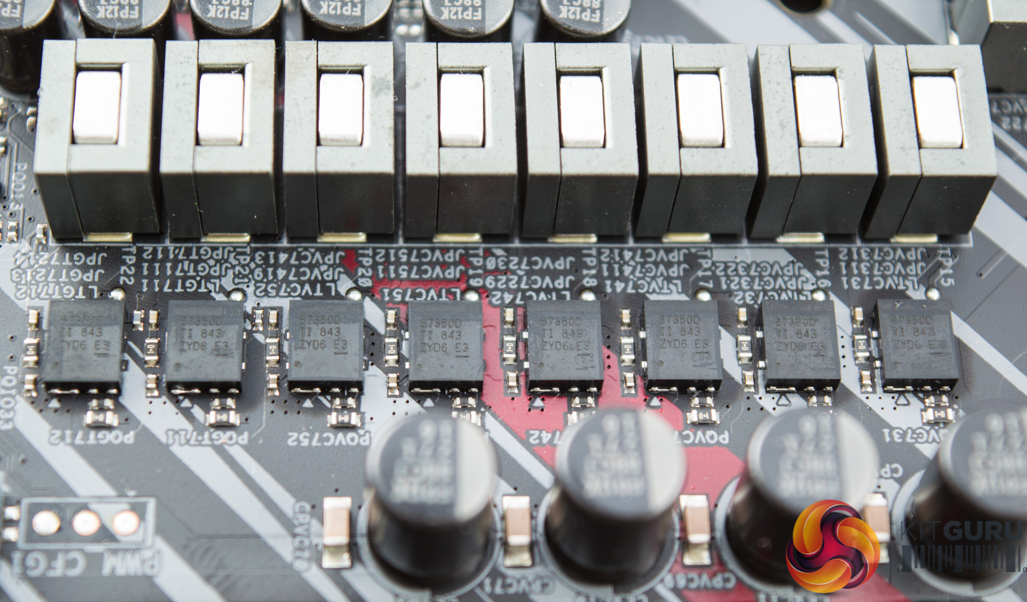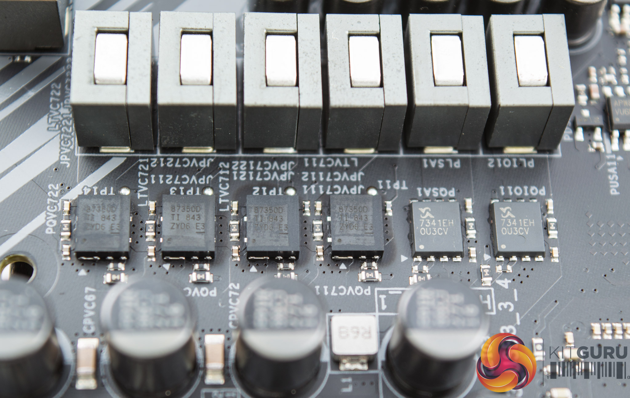 The VCore and iGPU phases all use 87350D Texas Instruments NextFETs (40A) which are integrated high and low-side packages. The two additional rails, 1 phase for VCCSA and 1 phase for VCCIO, use Sinopower SM7341EH integrated MOSFETs, capable of 44 amps, with Anpec APW8720B single phase controllers.