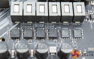 The specific breakdown of the VRM is 10 phases for the VCore using 5 PWM signals from the IR35201 with 5 IR3598 doublers, then 2 PWM signals for the 2 iGPU phases with an IR3598 acting as the driver for both phases.
