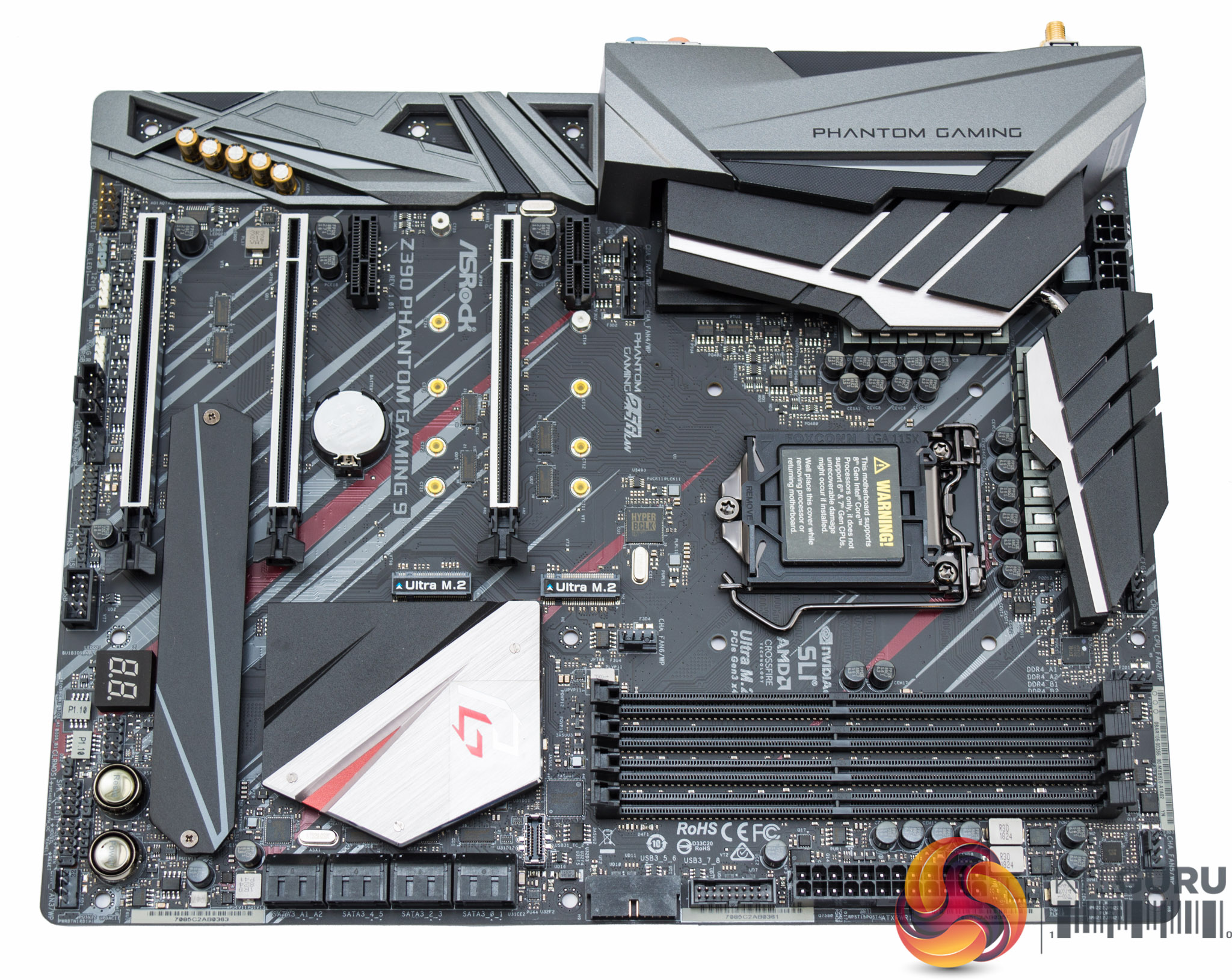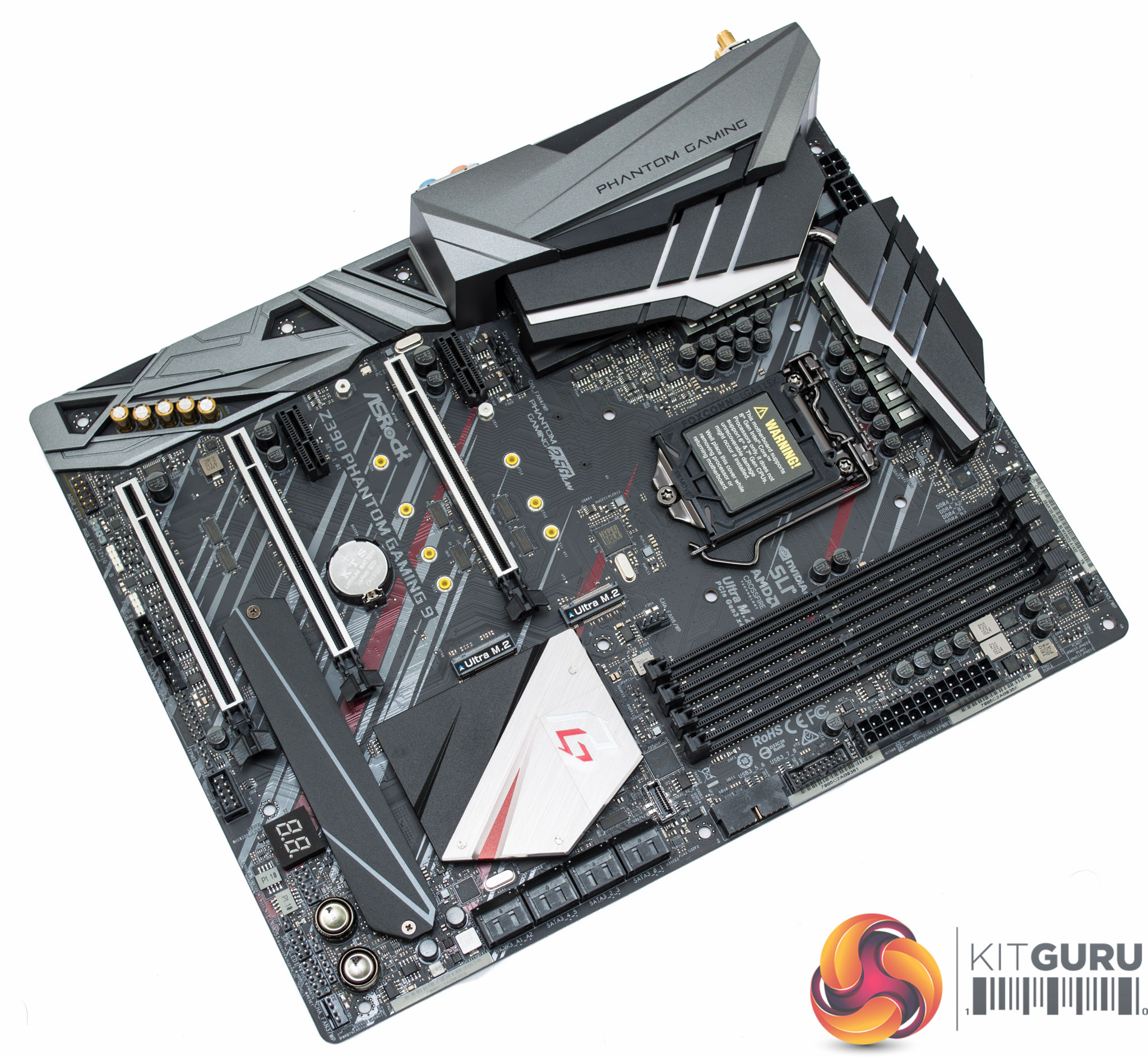 The ASRock Z390 Phantom Gaming 9 is fairly reminiscent of other Intel 300-series Fatal1ty series products in its appearance, such as the Fatal1ty H370 Performance. It's colour scheme is a mixture of black, grey and silver with subtle red accenting and there's a stylised rear I/O cover and heatsinks.