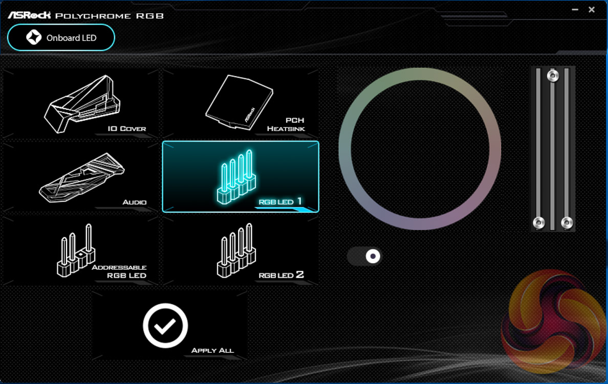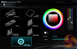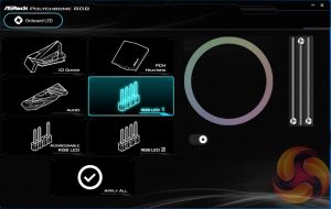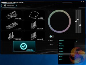 ASRock Polychrome RGB seems to be a rebranding of the previous ASRock AURA RGB, perhaps due to naming similarities with the ASUS AURA RGB solution. The new software is a little bit slicker with handy visualisations of each of the available zones that can be altered – on this board there are three RGB headers and three onboard RGB lighting zones.
