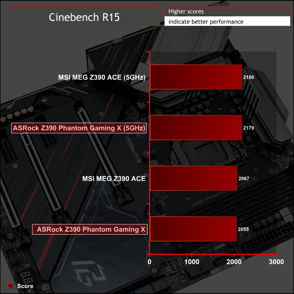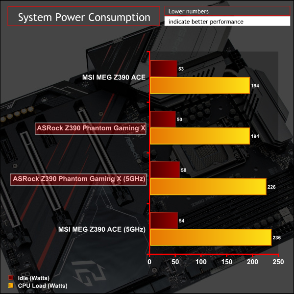 Overclocked performance and power consumption align very closely to the MSI Z390 MEG ACE, a highly acclaimed motherboard that we also reviewed.