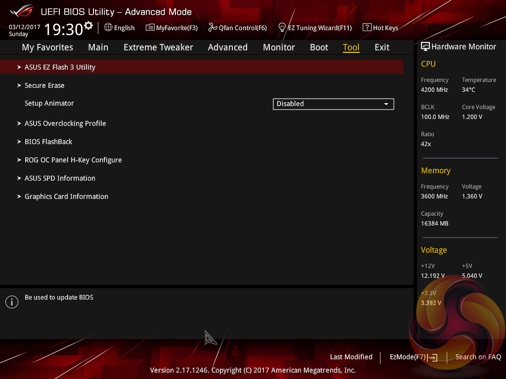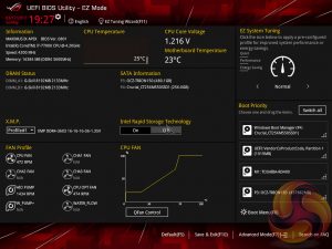 The ASUS UEFI enters straight into the EZ Mode splashscreen which has a selection of frequently used settings including XMP profiles, boot device order and fan speeds. Pressing F7 takes the user into the advanced section of the UEFI but there are some additional tools that can be accessed from the splash screen.