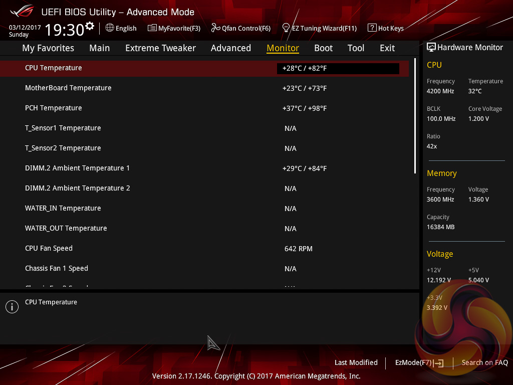 The Monitor tab will allow the user to instruct the UEFI how to handle temperature data from the various sensors as well as what to do with fan speed profiles. For example where a fan speed profile is temperature dependant you can choose which temperature sensor to use. You'll also be able to check up on all the settings associated with the water cooling specific sensors like water flow rate and water temperature.