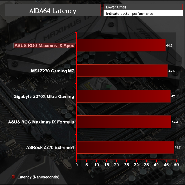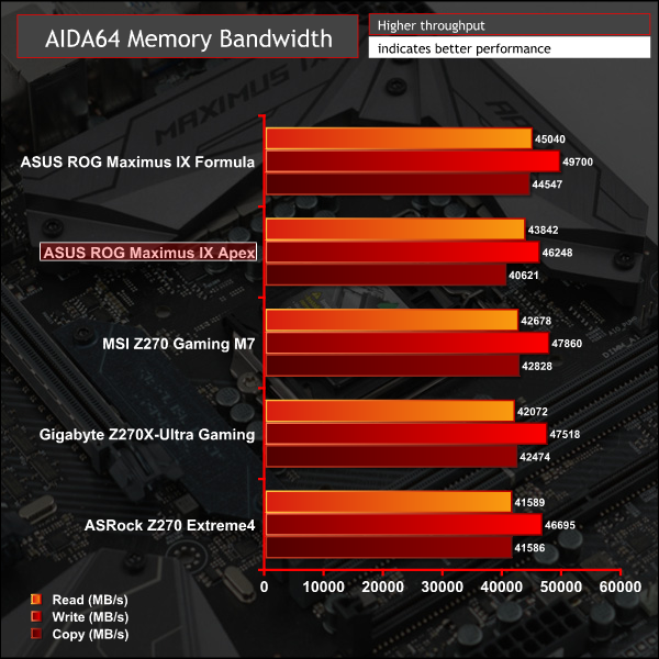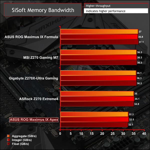 Memory performance was lower for the Maximus IX Apex than the Maximus IX Formula, it would seem that having less memory lanes does impact overall bandwidth but not by much. The Maximus IX Apex still keeps up with the competition and this small deficit doesn't play out in real-world scenarios.