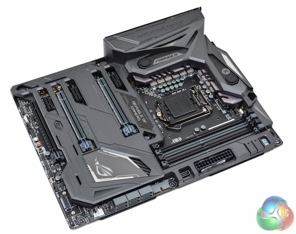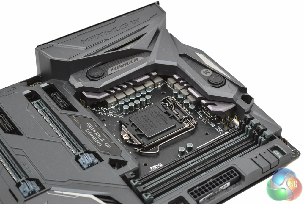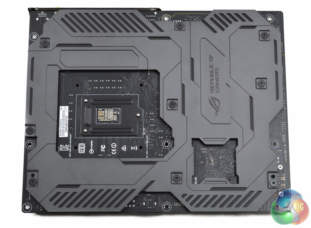 Underneath the Maximus IX Formula the shroud is metal and provides additional cooling and structural rigidity to the motherboard, whereas on top it is plastic and mainly for aesthetic purposes. The metal shroud on the bottom is easily removable with standard Phillips head screws should it pose any compatibility issues with CPU coolers or cases.