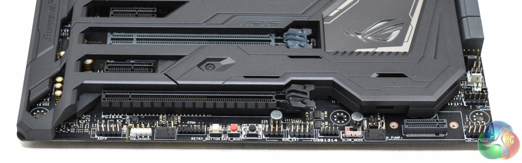 Along the base of the Maximus IX Formula is an array of buttons – MemOK!, Safe Boot and Retry, as well as a slow mode switch. In terms of interfaces there is a vertical facing M.2 port, to which ASUS provides an accessory bracket and mounting points for it, a couple more fan headers, front panel and audio, TPM, USB 2.0 and the ROG Extension header.