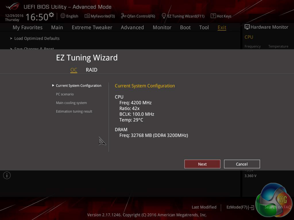EZ Tuning Wizard is the automatic overclocking engine for the Maximus IX Formula. It will calculate, based on user indicated cooling, the best possible CPU and DRAM overclocks achievable. It's a reasonably smart utility though most users will be able to do a lot better by simply enabling XMP then adjusting the multiplier and CPU vCore appropriately.