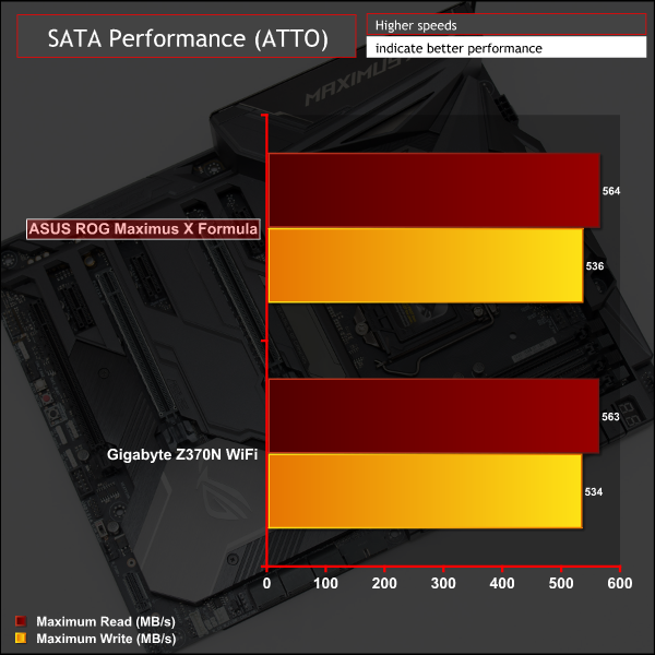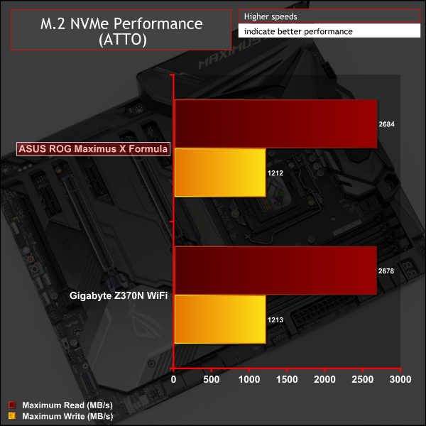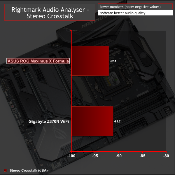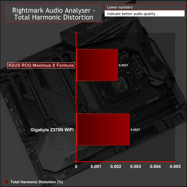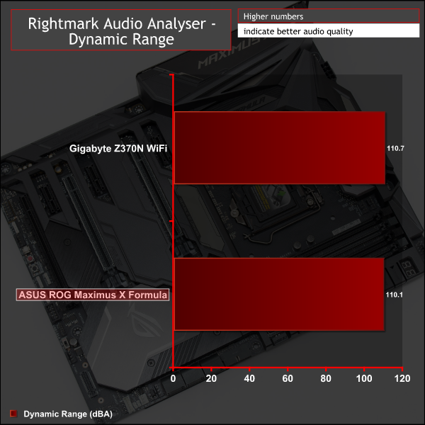 Audio performance is representative of a well-executed implementation of the Realtek ALC1220 codec. Maximus X Formula owners will be happy with the quality of the audio provided especially with the benefits of the Sabre ESS DAC and Texas Instruments operational amplifier.