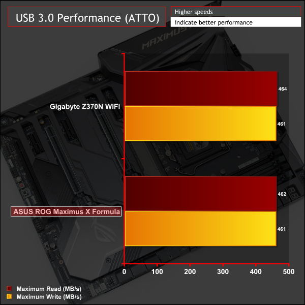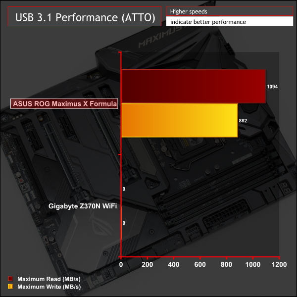 USB 3.1 and 3.0 performance were consistent with what we've seen from other X299 and Z370 motherboards running the same tests.