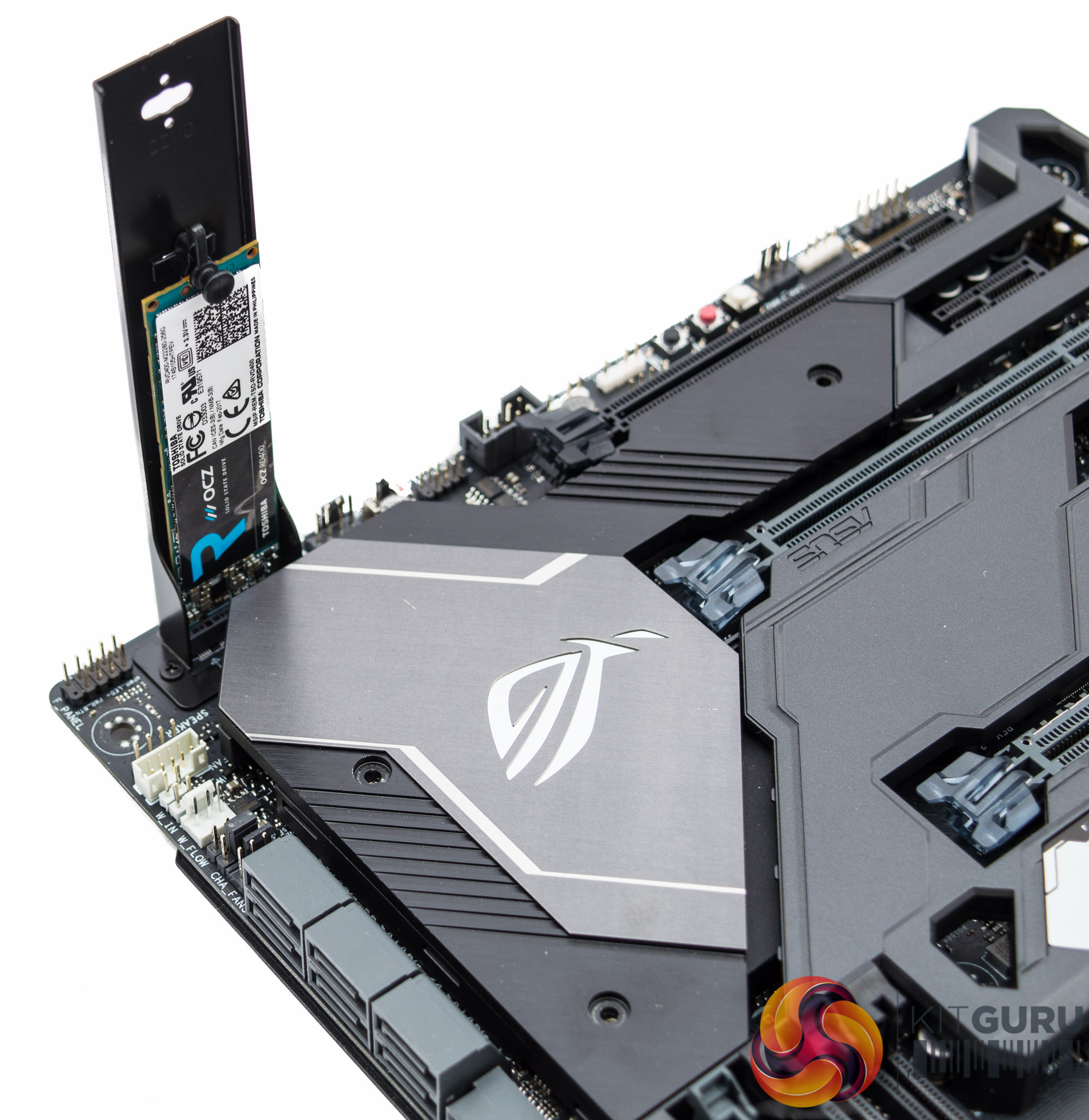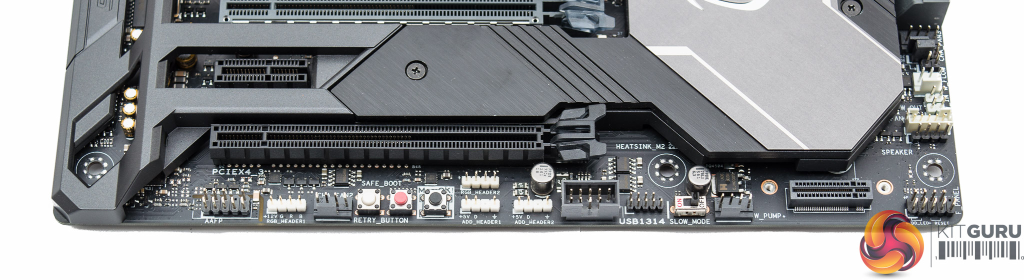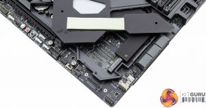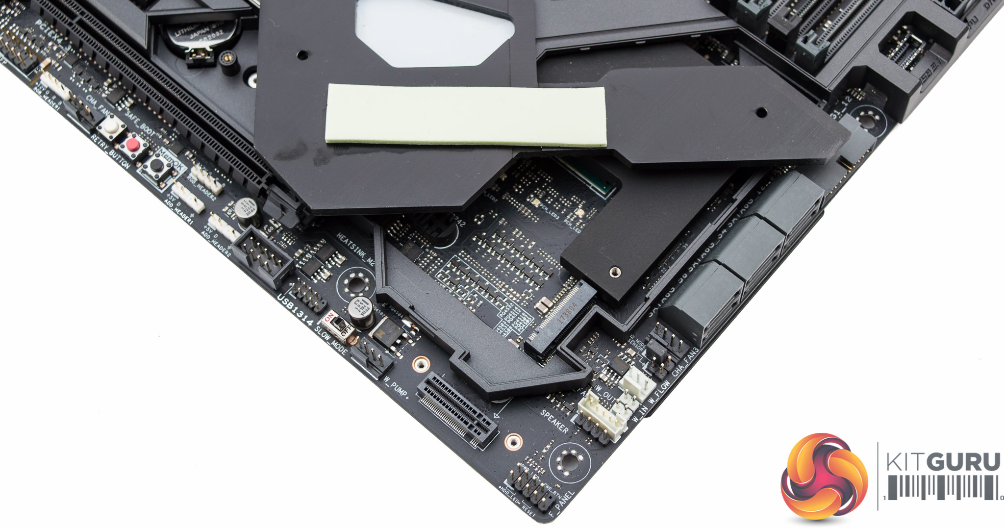 There are dual M.2 slots for the Formula one of which is horizontal and the other vertical. The horizontal M.2 connection sits below a heatsink with a thermal pad, the heatsink jointly cools the chipset PCH and the M.2 drive. Up to 110mm drives are supported in this slot in either PCIe or SATA mode.