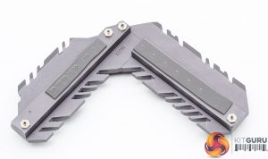 The EK CrossChill II waterblock uses G1/4″ fittings and uses copper water channels internally. The base makes contact via thermal pads and the water block integrates into a larger aluminium heatsink so it is effectively a hybrid solution that can run on air or water. ASUS claim up to 35 degrees Celsius lower temperatures when using water cooling.
