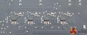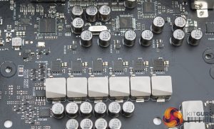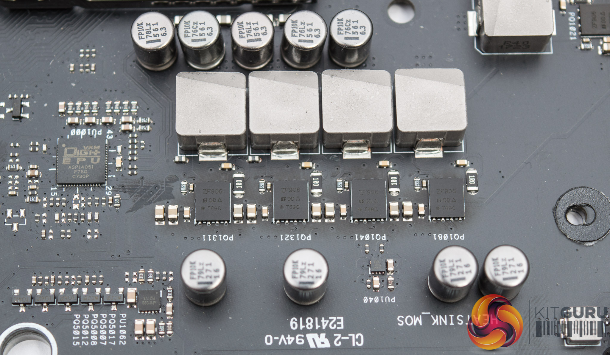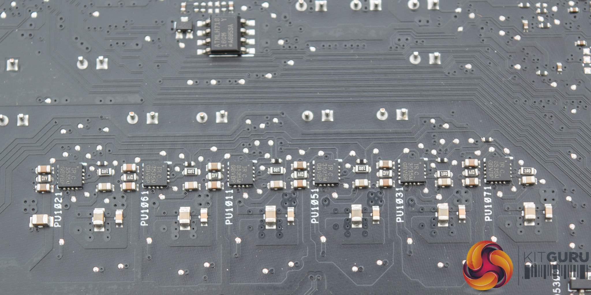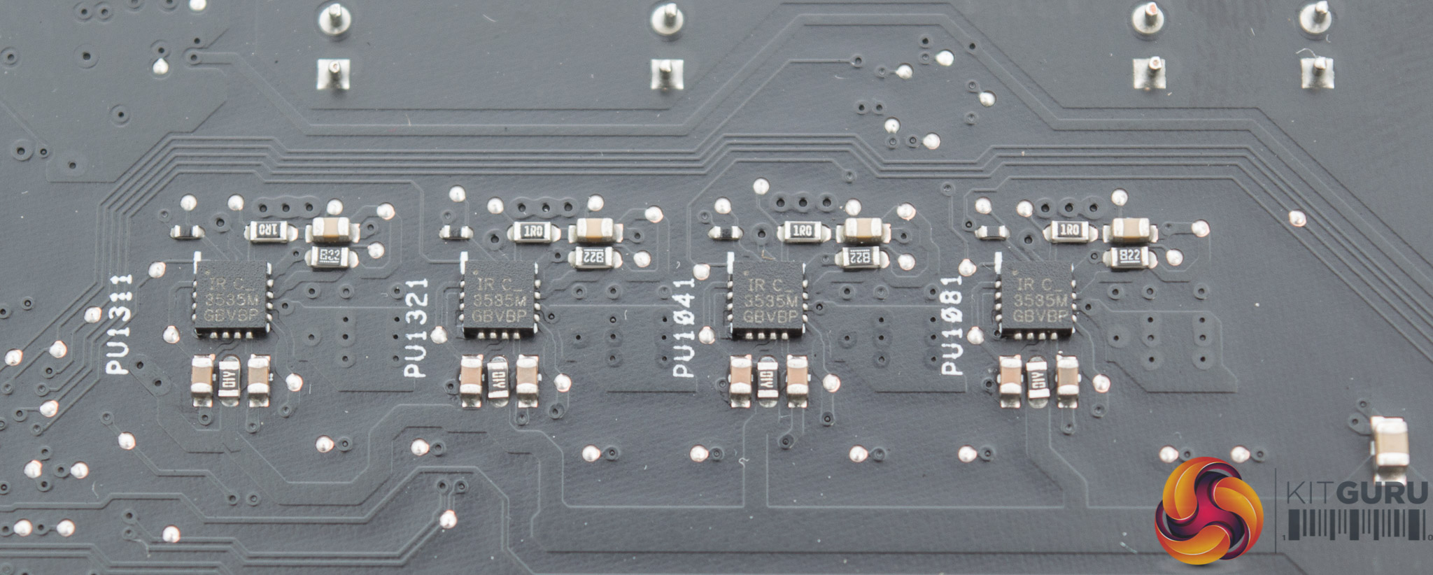 There are four International Rectifier IR3599 phase doublers in use too, three for the row of six and one for the row of four. Thus the likely configuration is that the PWM controller operates as a 4+2 VRM with the four IR3599 phase doublers turning those four phases into eight for a total of 8+2. Those ten phases probably split as eight phases for the vCore and two for the iGPU.