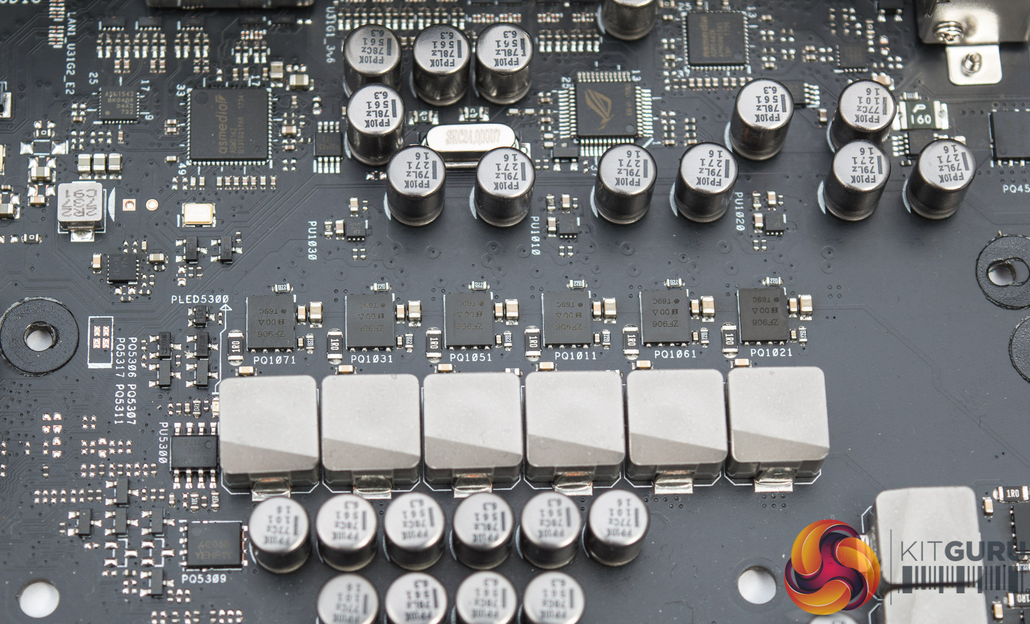 The audio components are high quality and consist of the Realtek ALC1220 codec (custom-packaged as ROG S1220), an ESS Saber DAC ES9023P, Texas Instruments RC4580 operational amplifier and Nichicon Gold Series audio capacitors. Everything sits on a separated PCB and the audio jacks are gold plated too.