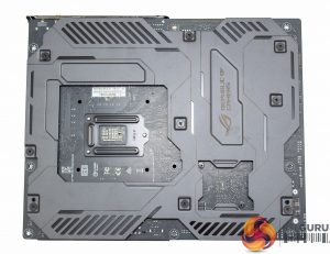 On the underside of the motherboard is the second part of the ROG Armor which is metal, not plastic like the top part, and includes an electrically insulating covering.