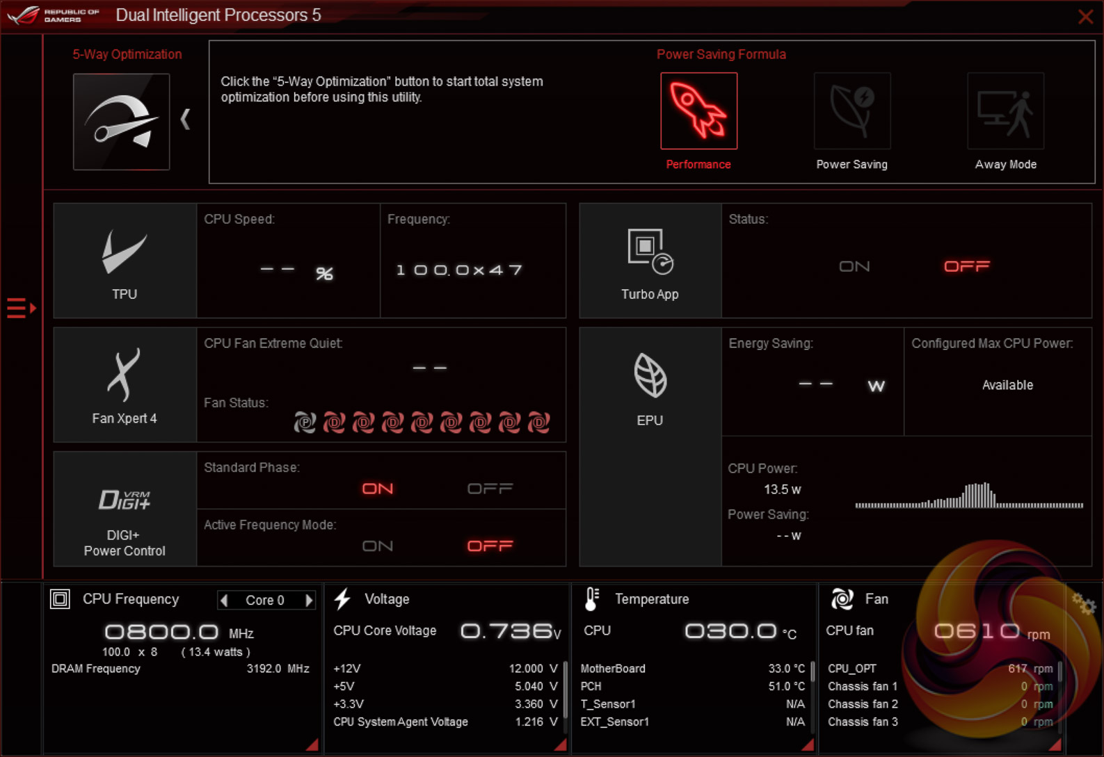 The main software utility for the ASUS motherboard range is the multi-function AI Suite III. It contains within it a significant number of utilities including the EPU and TPU, the Turbo App for core and application-specific turbo behaviour, Fan Xpert 4, on-the-fly overclocking support, a cleaning utility and an ASUS software updating tool.