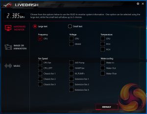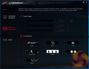 The new addition for the Maximus X Formula is software called LiveDash. This allows for the onboard OLED display to be configured to show a defined range of system parameters (hardware monitoring type functions) as text or show a monochrome image or animation. Users can upload a custom image or animation or pick from a range of pre-loaded options.