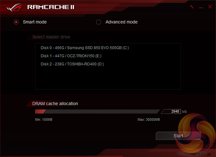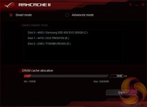 The ROG RAMCache II software, which complements pre-existing ROG RAMDisk software, aims to help with program loading and file transfers of regularly accessed data. Users simply need to set aside the amount of RAM they would like for caching and the RAM Cache II software handles everything else behind the scenes when in Smart mode. There is an advanced mode that gives some additional parameters for controlling the software's behaviour.