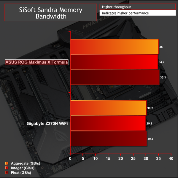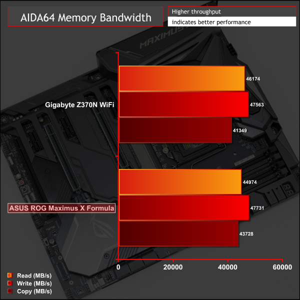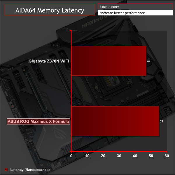 Memory performance varied slightly from benchmark to benchmark though the Maximus X Formula was using two more modules than the Gigabyte Z370N WiFi (ITX) which explains some of the variation.