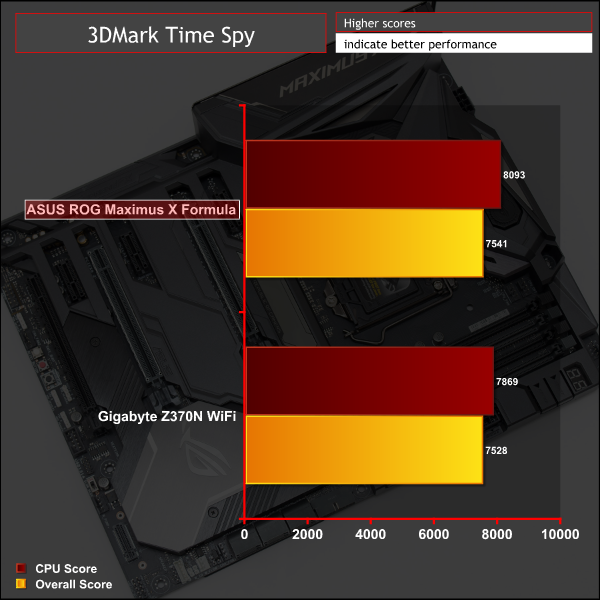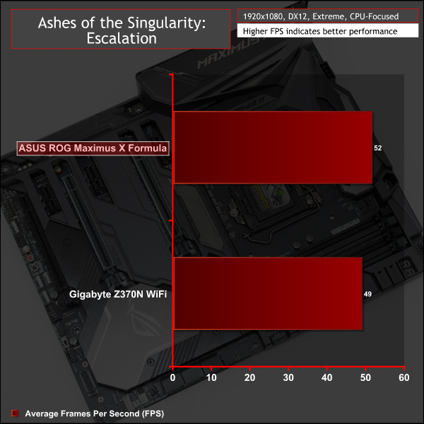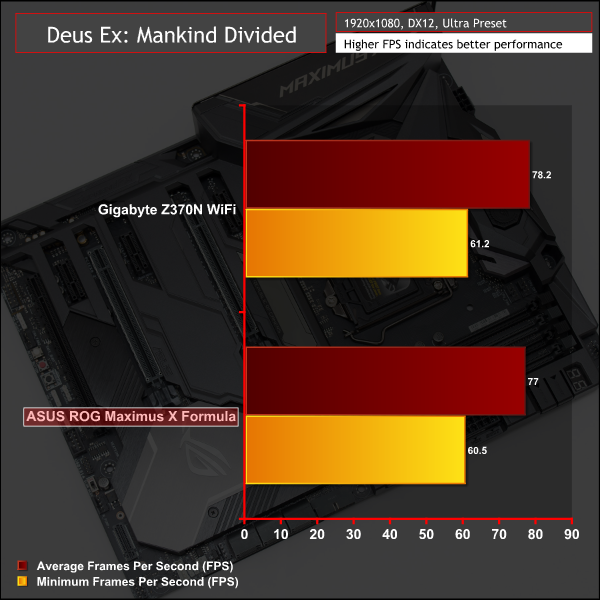 Gaming performance favoured the ASUS Maximus X Formula in two out of three tests but by slim margins that can be put down to margin of error and GPU boosting variation.