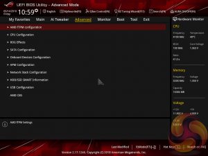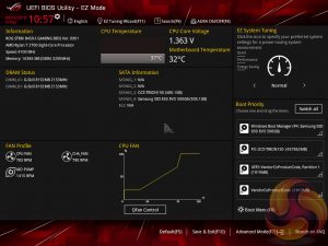 The ASUS UEFI enters straight into the EZ Mode splash screen which has a selection of frequently used settings including XMP profiles (called D.O.C.P on AMD ASUS motherboards), boot device order and fan speeds.