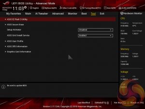 Pressing F7 takes the user into the advanced section of the UEFI but there are some additional tools that can be accessed from the splash screen such as Q-Fan Control and EZ System Tuning.
