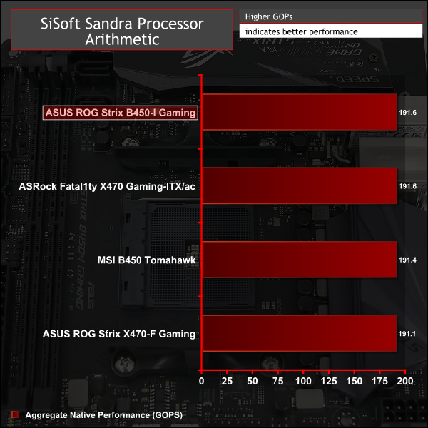 SiSoft Sandra 2018 is a multi-function utility program that supports remote analysis, benchmarking and diagnostic features for PCs, servers, mobile devices and networks. We run the application’s processor arithmetic test to gauge the CPU performance on each tested motherboard.
