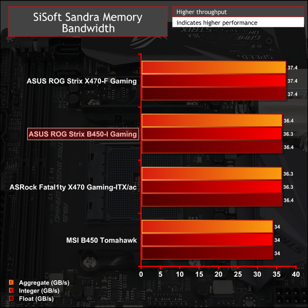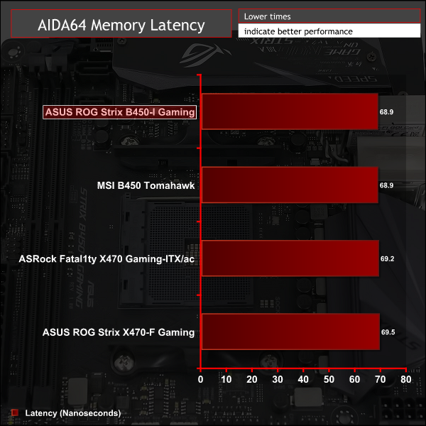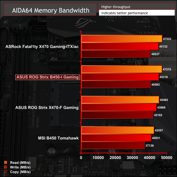 Memory performance for the ASUS B450 mini-ITX motherboard was very good and varied only slightly to the ASUS X470-F motherboard, likely because mini-ITX supports two less modules. Indeed, performance with the two-module ASRock X470 Gaming-ITX/ac was almost identical.