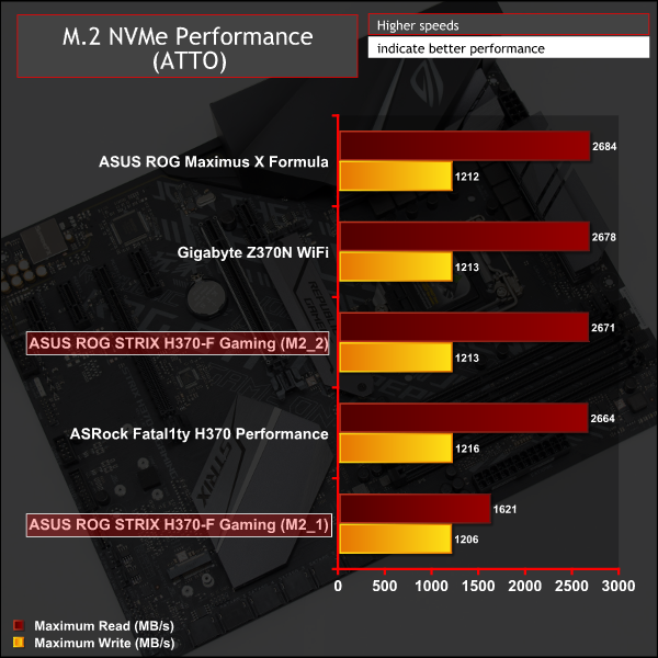 M.2 performance takes a real hit in the PCIe 3.0 X2 slot (M2_1), reducing maximum read speeds from 2.6 to 1.6 GB/s.