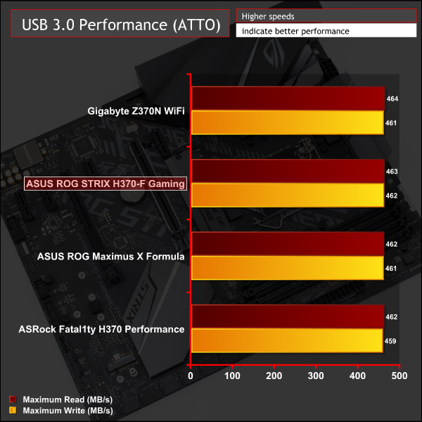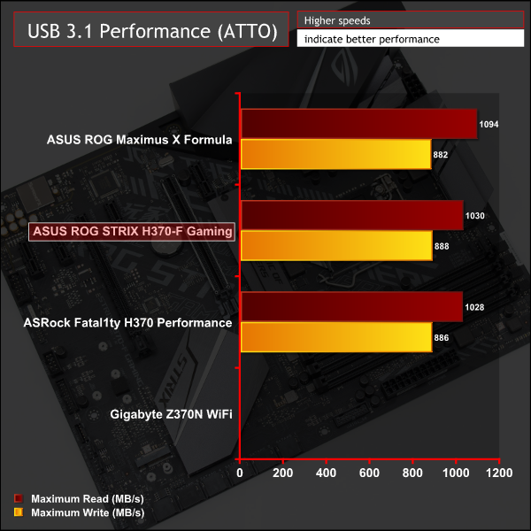 USB 3.1 and 3.0 performance are roughly the same as Z370.