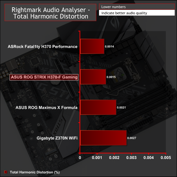 Audio performance on the ASUS ROG Strix H370-F Gaming was exemplary and easily matches Z370 motherboards since it's almost an identical audio solution to many ASUS Z370 motherboards.