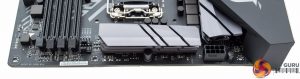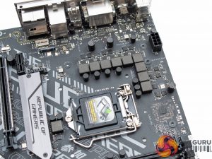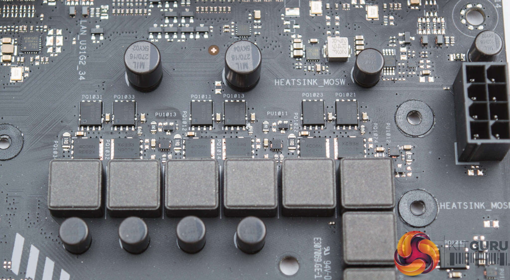 The exact configuration isn't immediately clear since the PWM controller is custom-packaged but it looks like a 9 phase design for the CPU comprising of 4 phases doubled to eight (for the VCore), plus a 9th phase for the iGPU (true 4+1, virtual 8+1). There are five smaller chips around and in between the CPU MOSFETs that are likely to be doublers. Then there are a number of other minor rails around the socket for things like VCCIO and VCCSA.