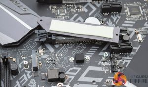 In the middle of the board is the cooled M.2 slot (M2_1) which is cooled by a custom heatsink. There is a fairly significant design oversight here which is that this cooled slot can only run at PCIe 3.0 2X, limiting the speed of most performance M.2 drives, while the full speed M.2 slot (M2_2) is not cooled.